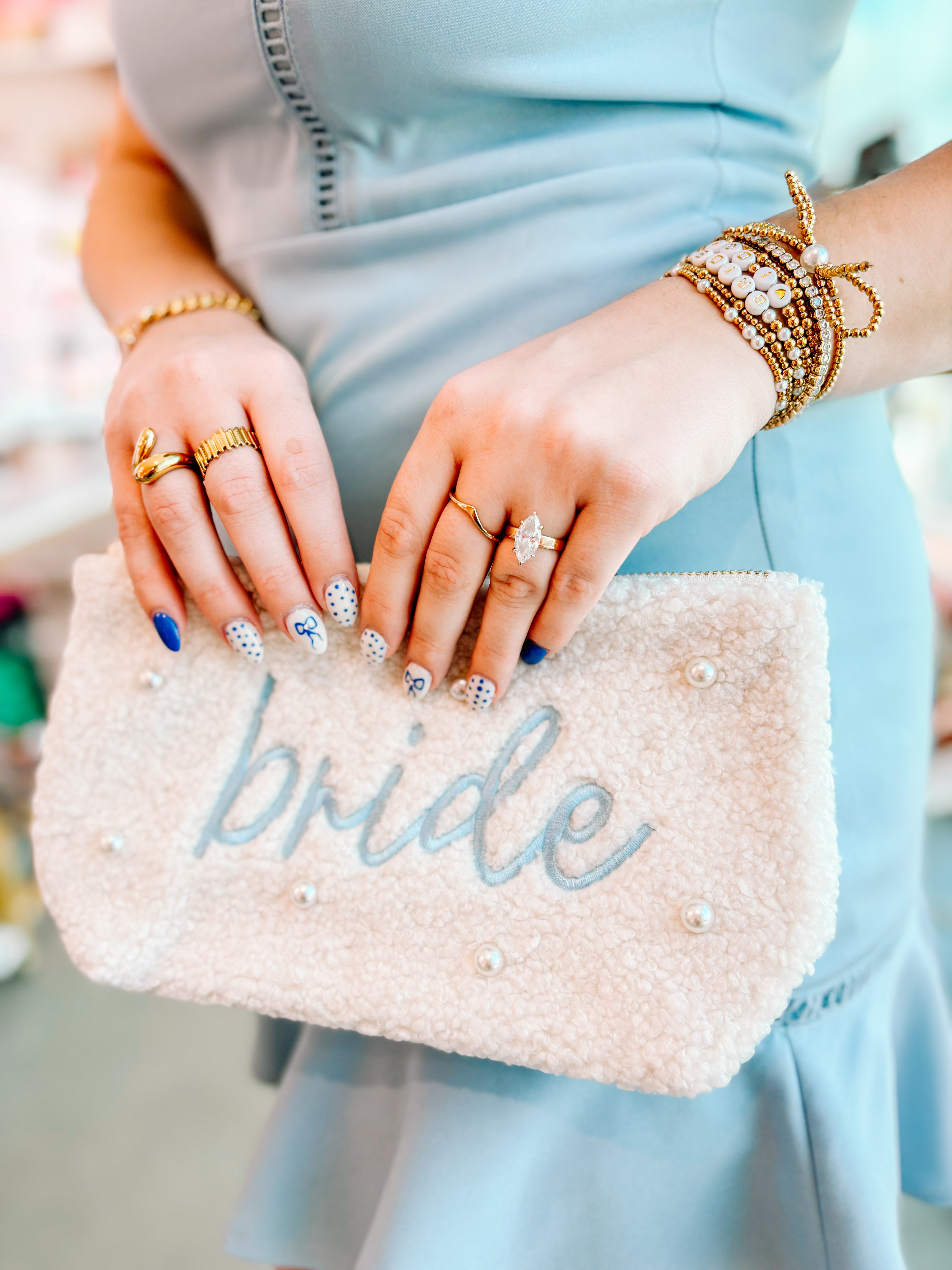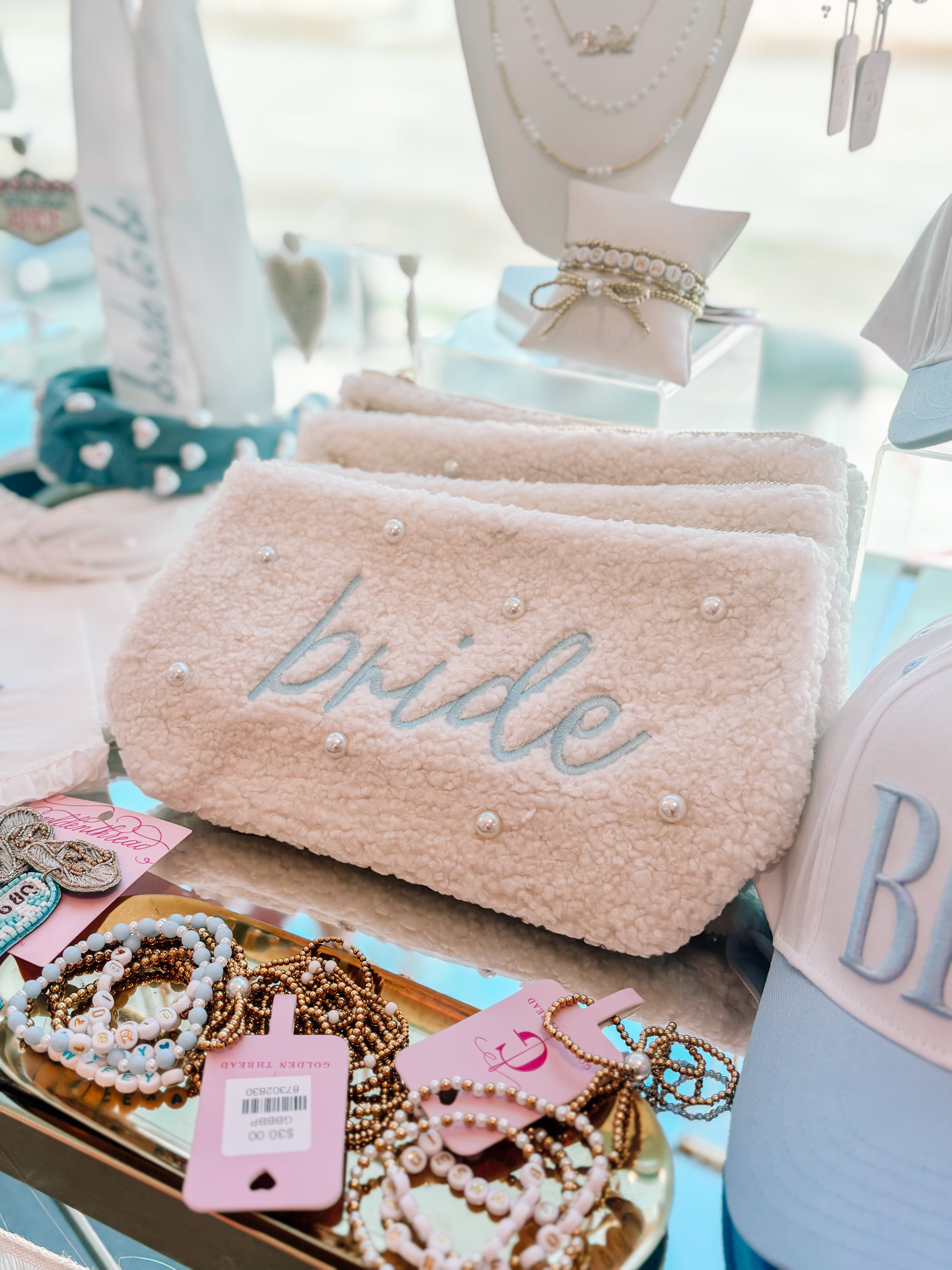 Carry your bridal essentials in style with this cozy fleece pouch! Soft, plush fabric keeps your treasures safe while adding a touch of whimsy to your wedding day. Perfect for stashing lipstick, rings, or those "just in case" emergency items. The pearl accent gives it an elegant vibe that matches your special day aesthetic. Whether you're a bride-to-be or celebrating a friend's big moment, this charming pouch is the perfect companion for making memories.