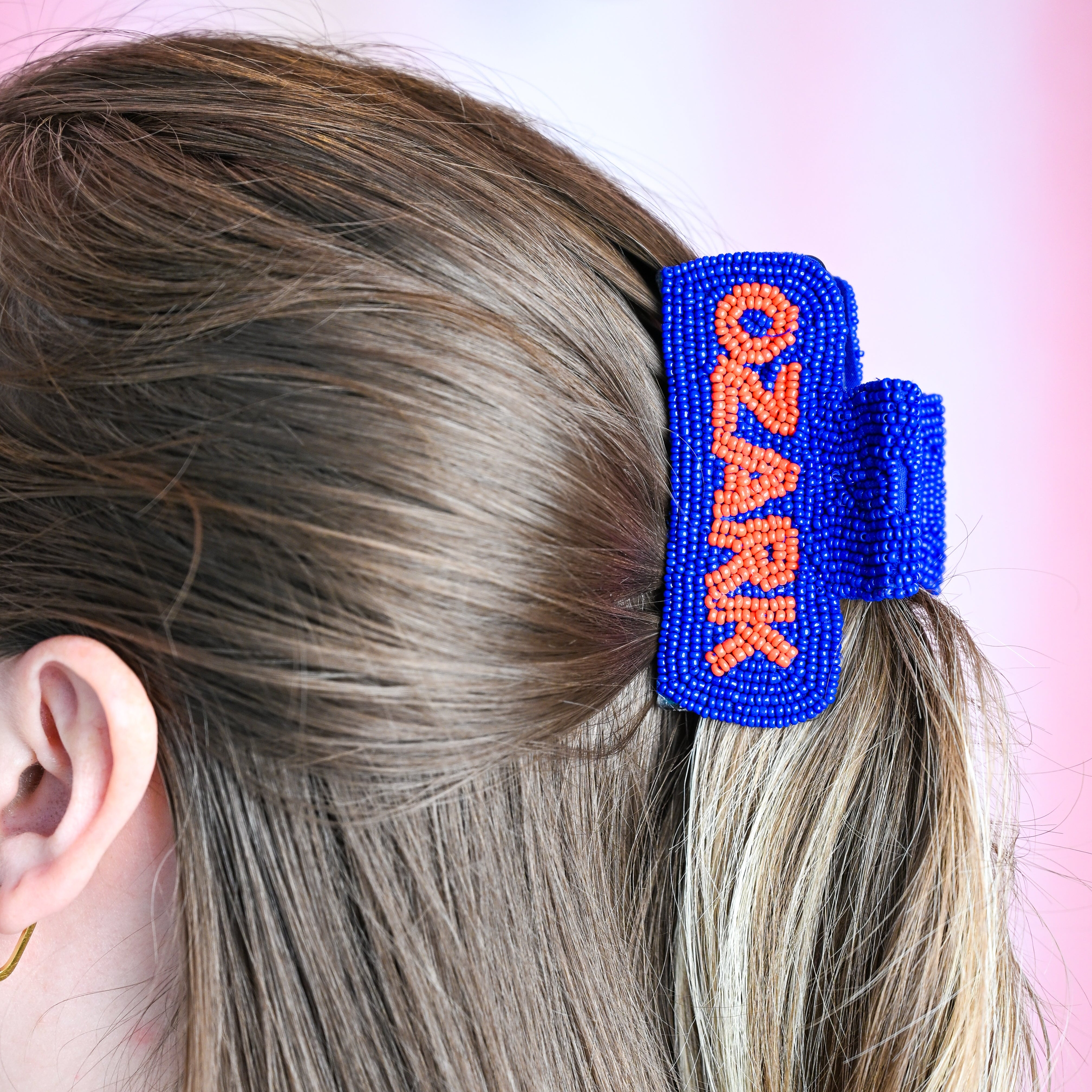 Keep your hair secure and stylish with this beaded claw clip, the perfect accessory for Camp Ozark enthusiasts. Featuring vibrant beadwork that celebrates camp spirit, this durable clip holds hair firmly in place while adding a pop of color to any summer look. Lightweight and comfortable for all-day wear, it's an ideal companion for outdoor adventures, poolside hangouts, and everything in between. Show your camp pride wherever you go!