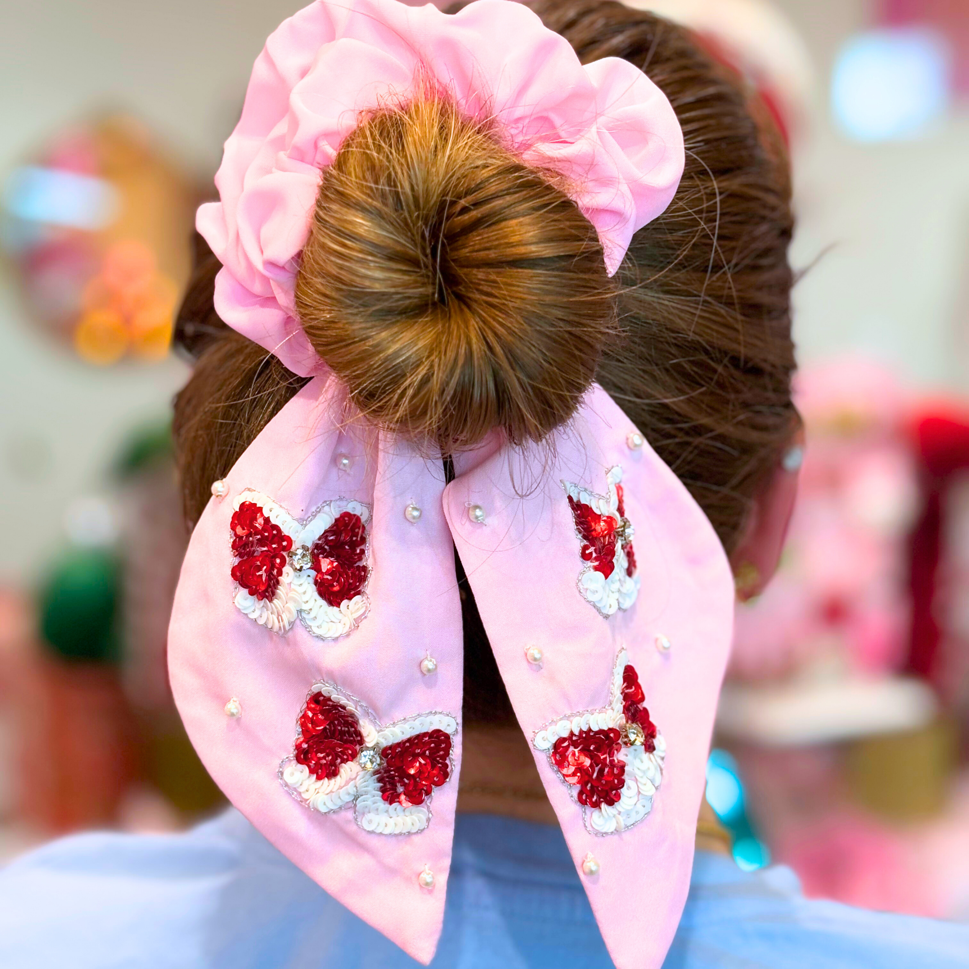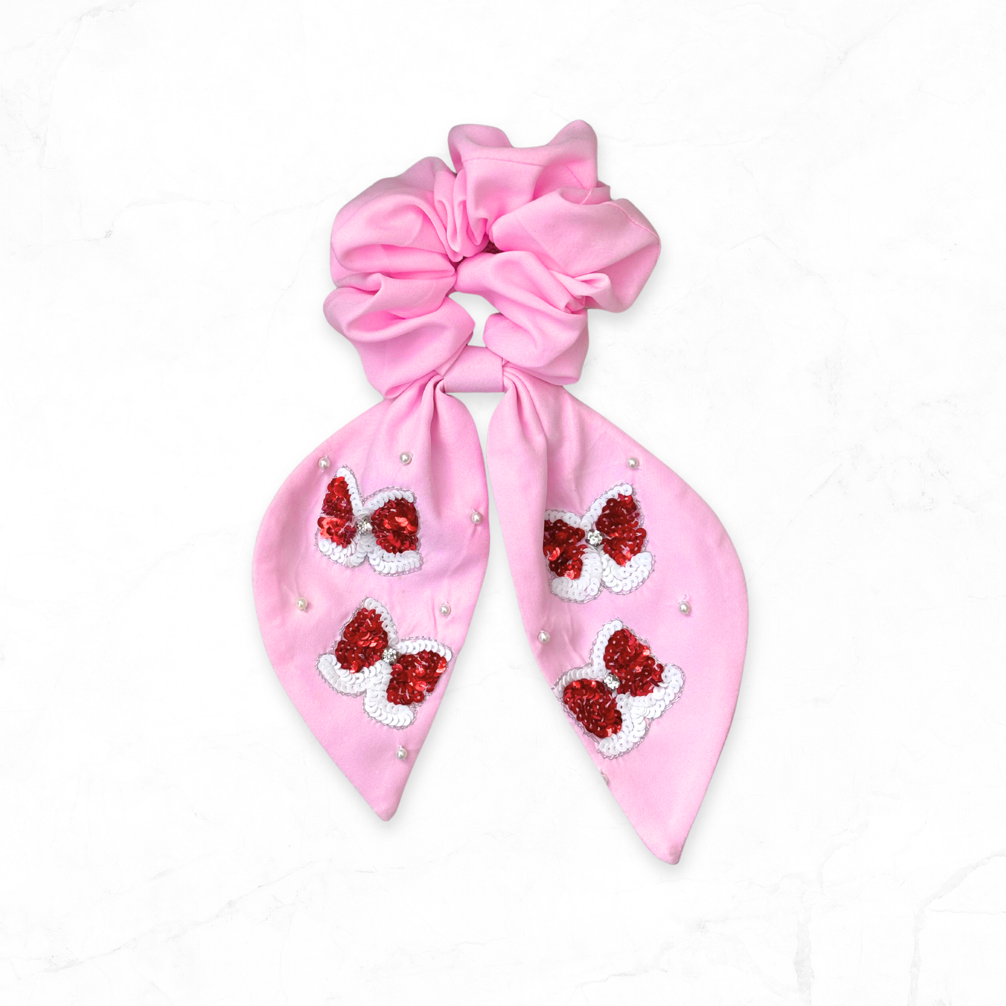 Pink Sequin Red Bow Scrunchie