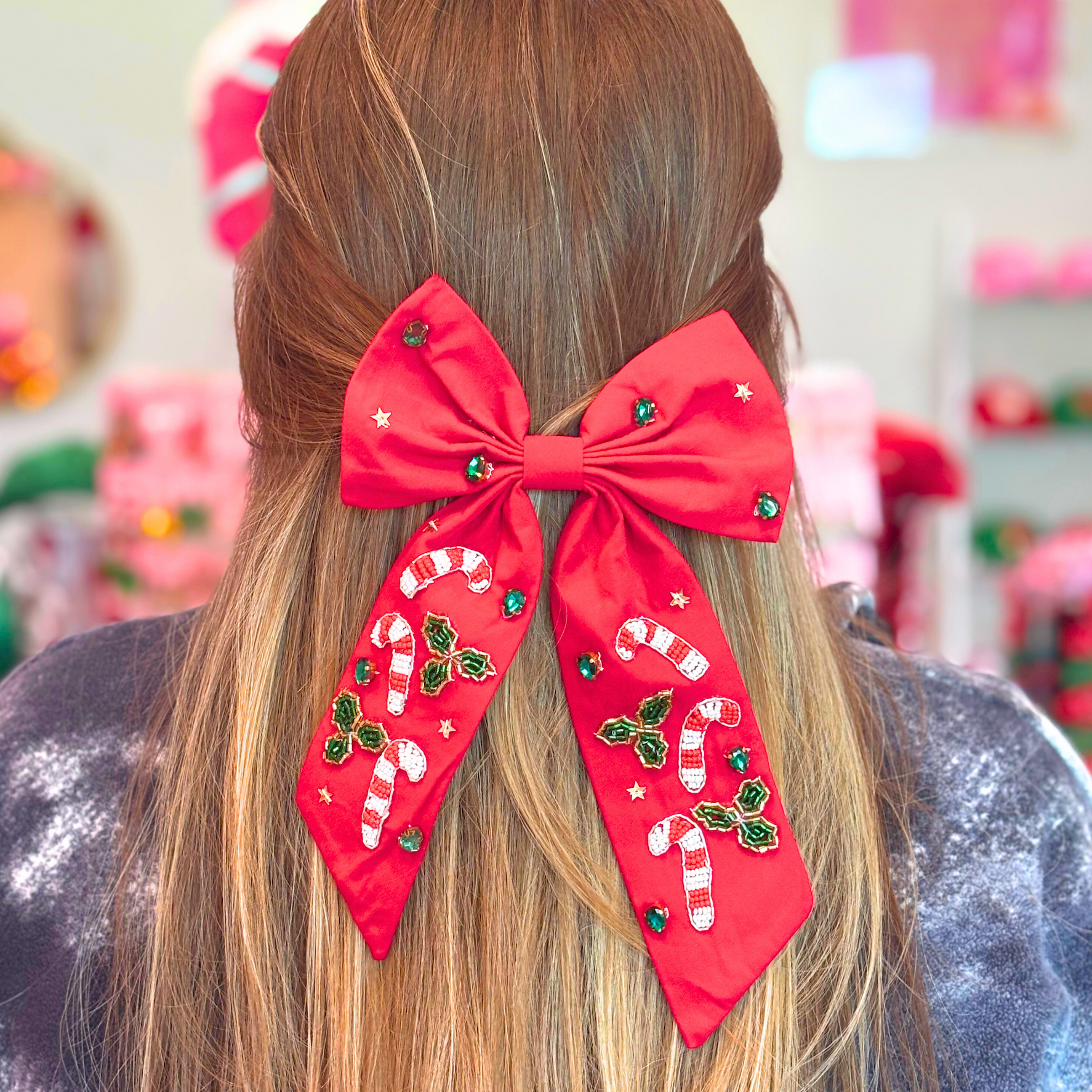 Add a festive pop to your holiday look with this charming Red Candy Cane Hair Bow. Featuring classic red and white stripes reminiscent of everyone's favorite seasonal treat, this playful accessory brings instant cheer to any hairstyle. Perfect for holiday parties, family gatherings, or spreading Christmas spirit all season long. Whether you're styling an updo or adding flair to flowing locks, this sweet bow delivers nostalgic fun with a modern twist. A delightful way to celebrate the season in style!