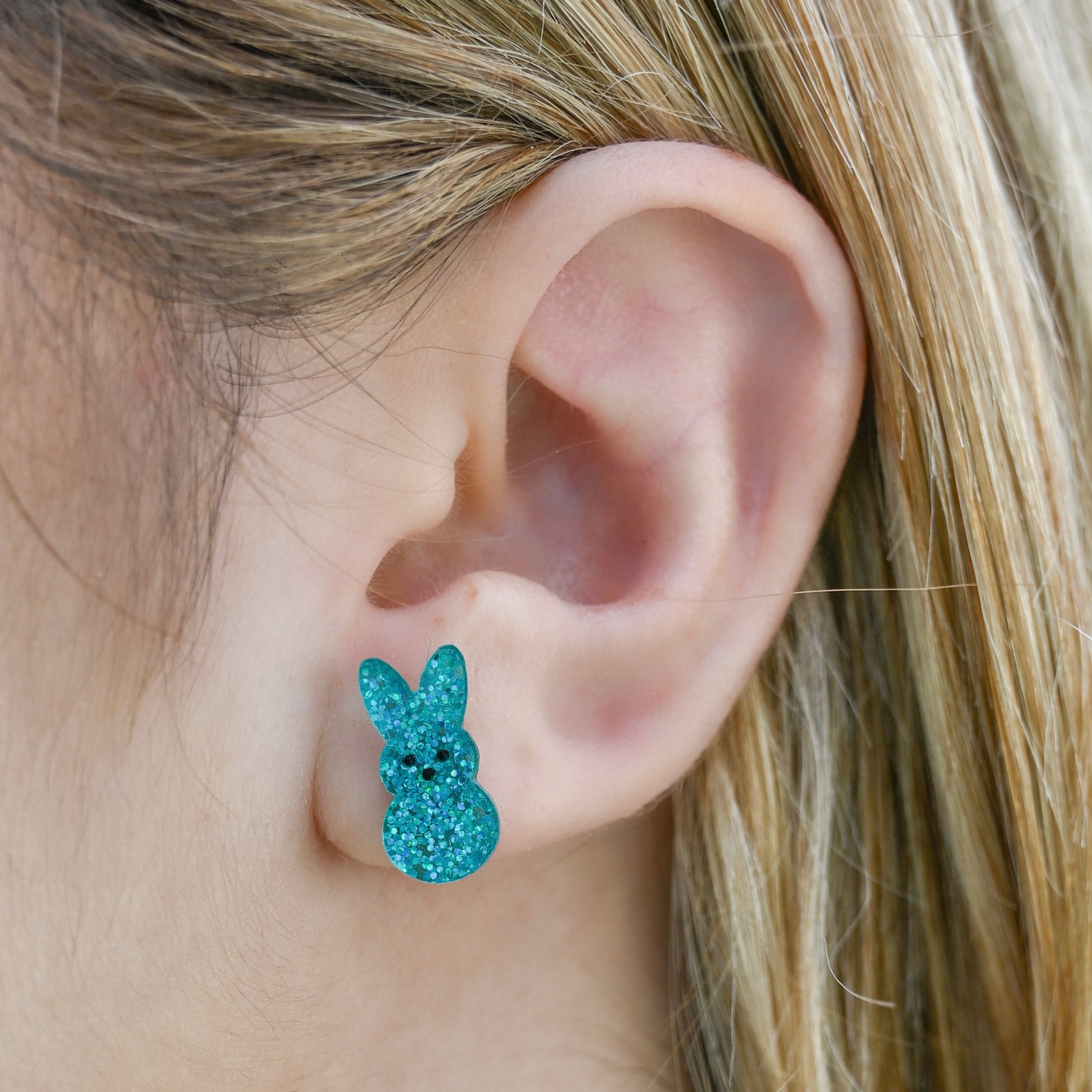 Adorable stud earrings featuring playful peep designs with shimmering glitter accents. Perfect for adding a touch of sparkle and whimsy to any look, these lightweight studs are comfortable for all-day wear. Ideal for those who love fun, eye