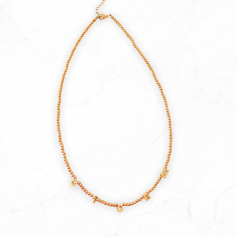 Show your Aggie pride with the Gig Em Gold Beaded Necklace! Perfect for game day excitement, this fun accessory adds a splash of bold, golden spirit to any outfit. Whether you're cheering from the stands or celebrating with friends, this necklace keeps your Aggie energy shining bright. Wear it loud, wear it proud—Gig ’em!