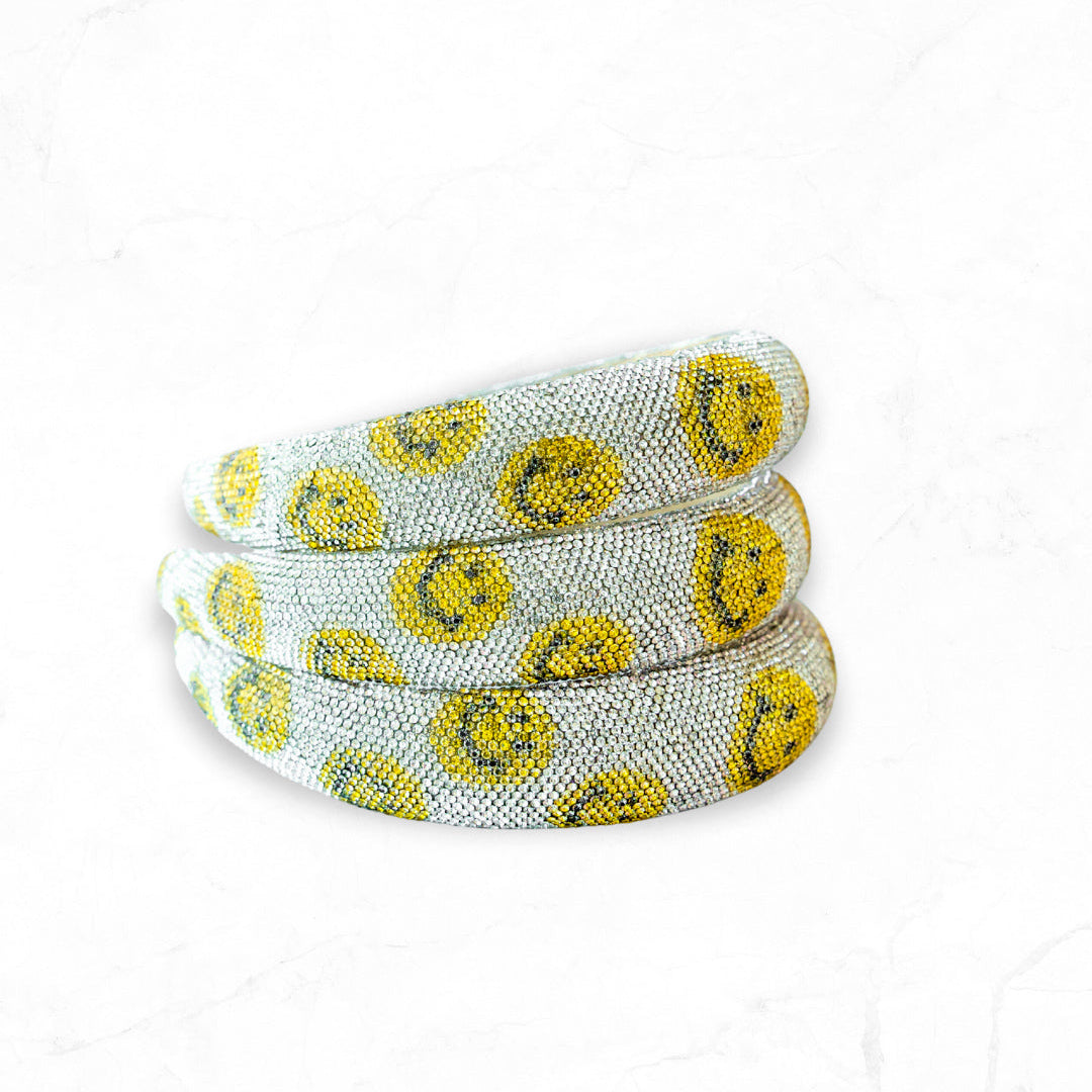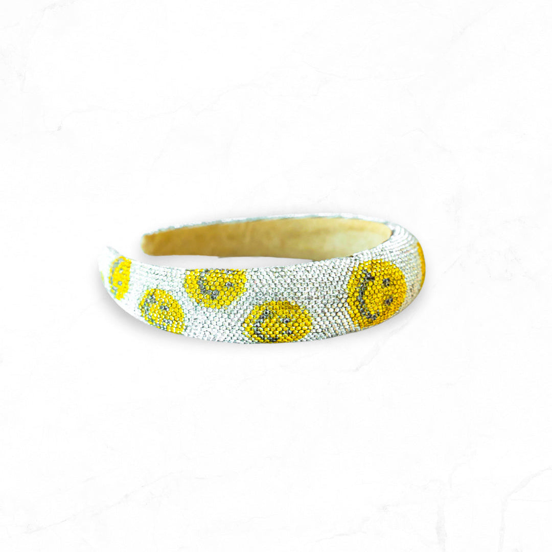 Shine bright with the Glitzy Smiley Headband in Yellow! This playful accessory sparkles with glittery beads and features a cheerful smiley face, adding a fun and sunny touch to any outfit. Comfortable and eye-catching, it’s perfect for spreading good vibes all day long.