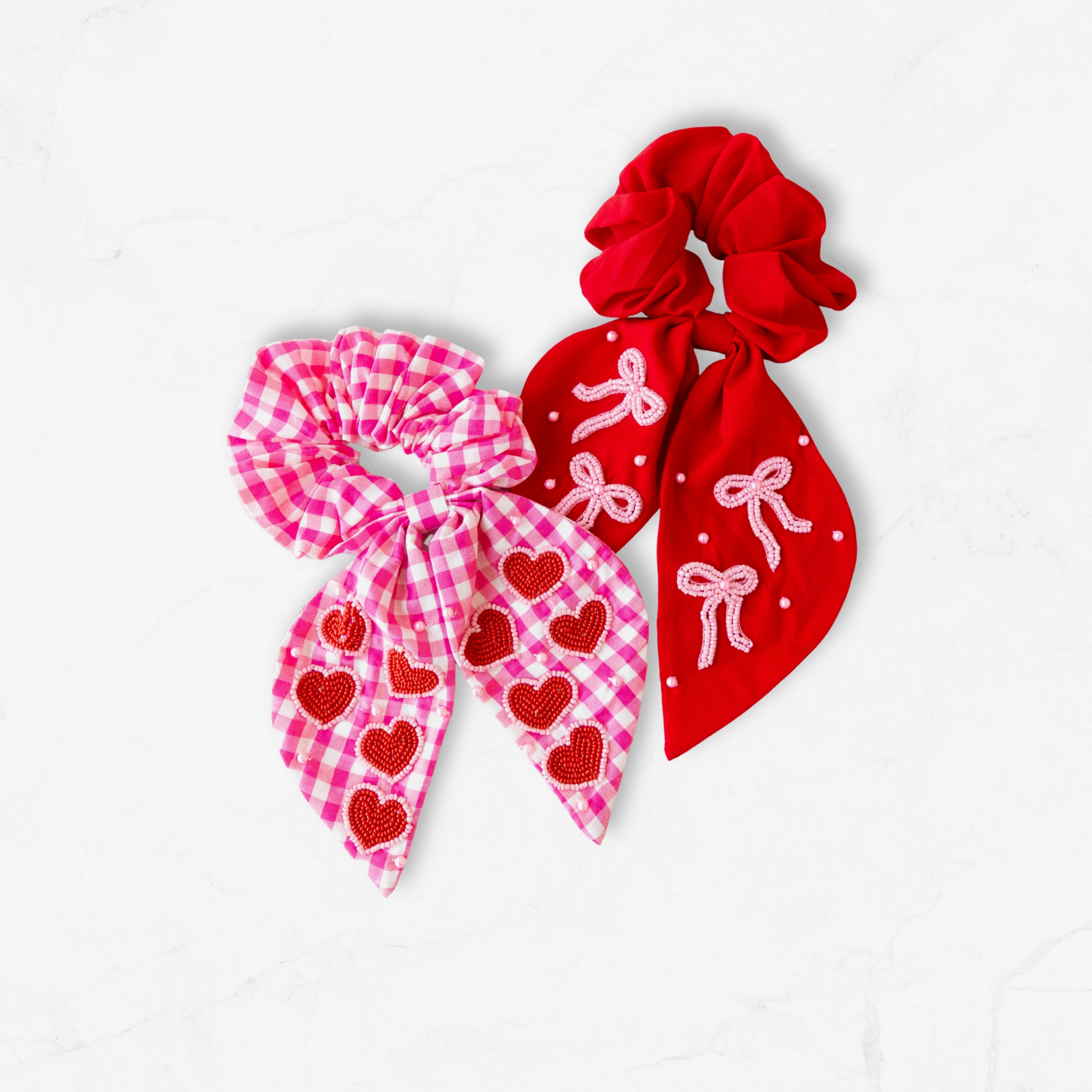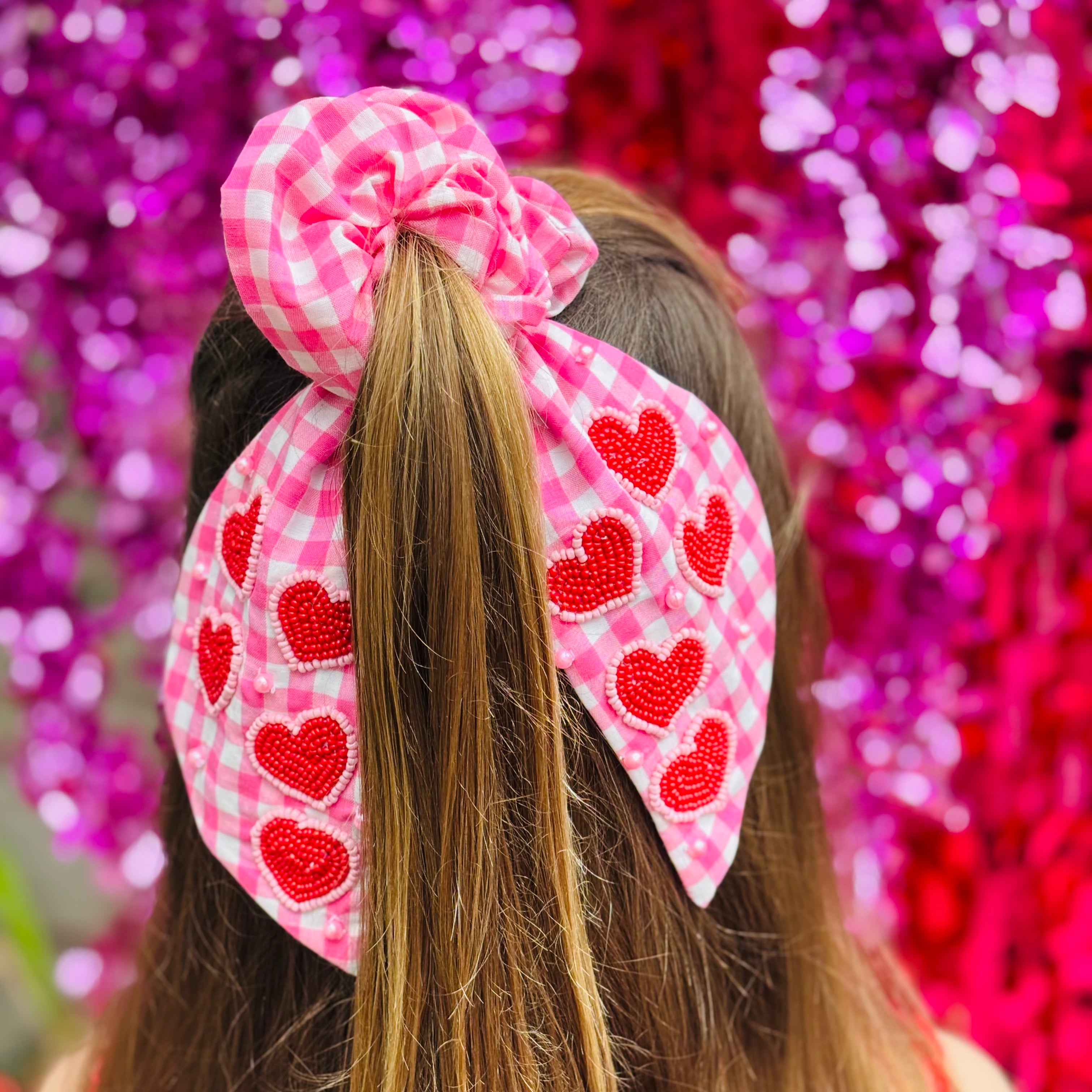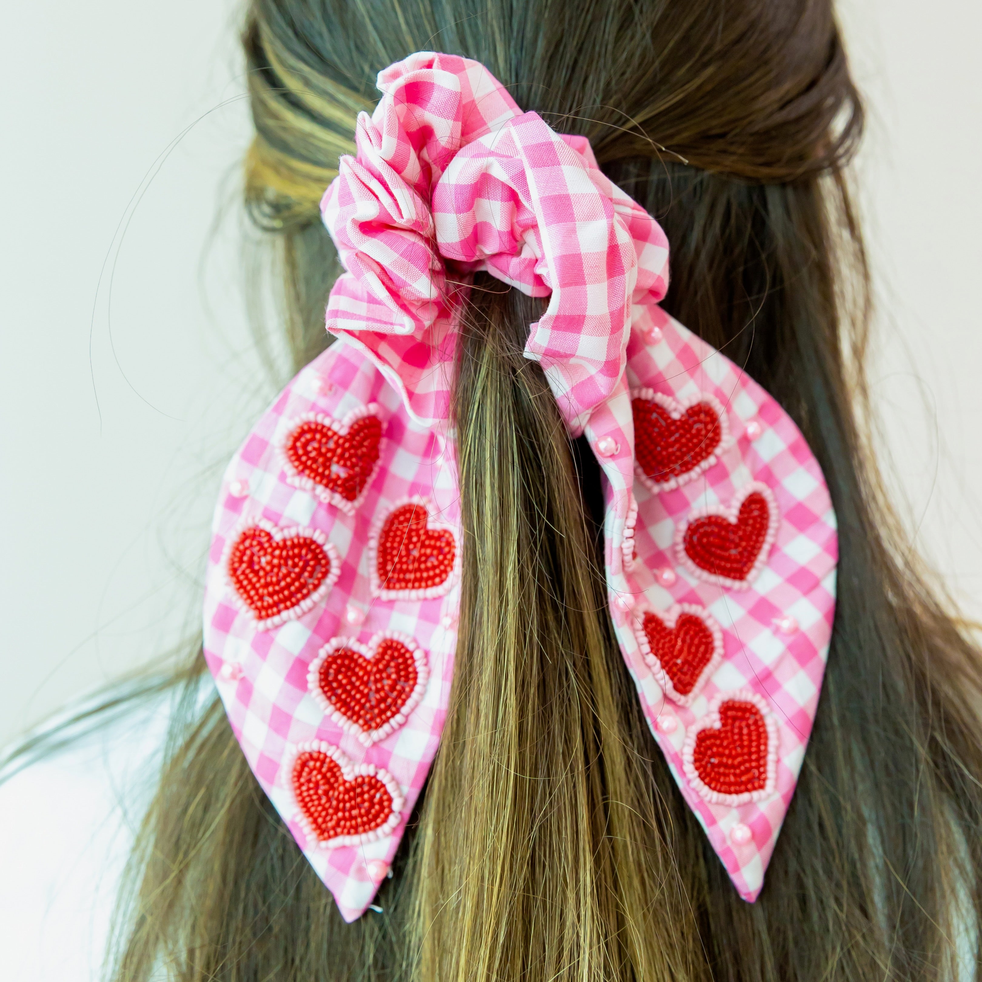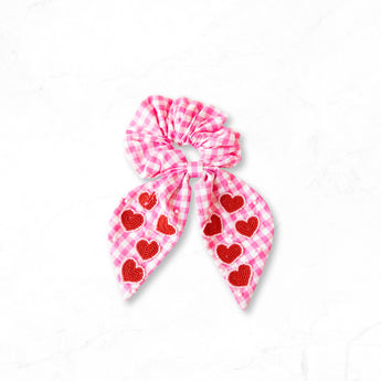 Keep your hair styled in sweetness with this charming gingham scrunchie! The pink and white checkered pattern pairs perfectly with a bold red heart accent, creating a look that's equal parts cute and fun. Gentle on your hair while holding strong throughout the day, this scrunchie works for ponytails, buns, and everything in between. Perfect for adding a pop of personality to any hairstyle—because your hair deserves accessories as fabulous as you are!