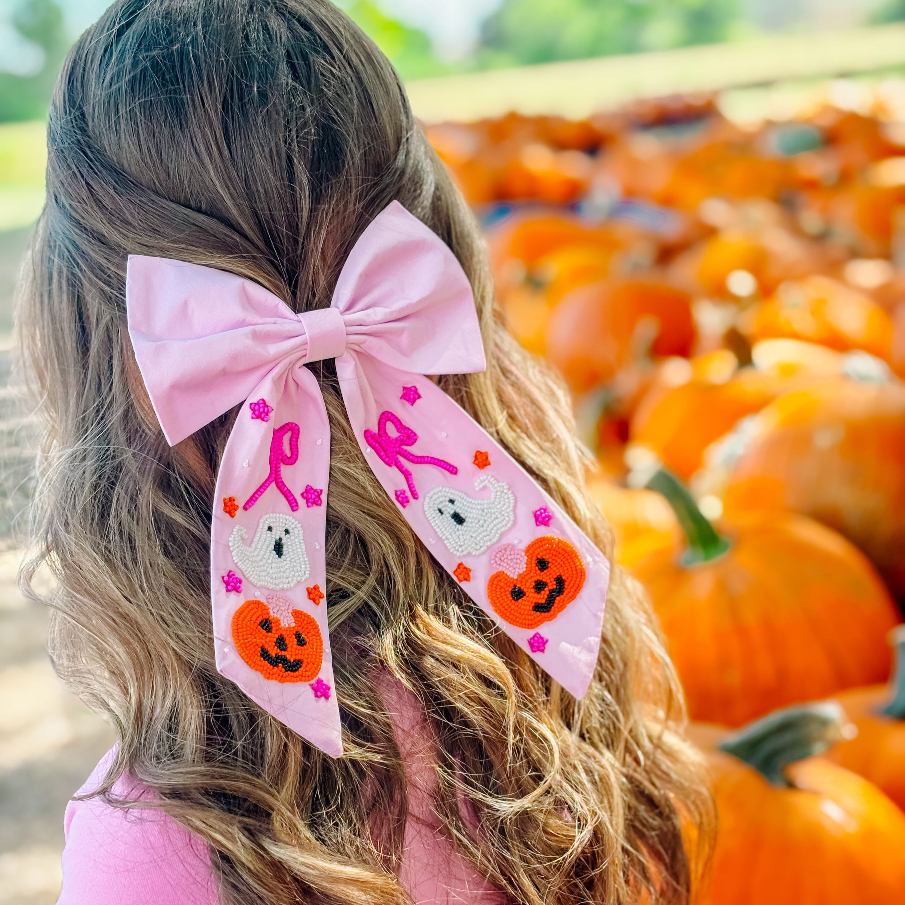 Add a playful pop of pink to your Halloween look with our Pink Halloween Beaded Bows! These charming hair clips sparkle with festive beads, making them perfect for trick-or-treating or any spooky celebration. Cute and colorful, they’re the perfect accessory to brighten up your holiday hairstyle.