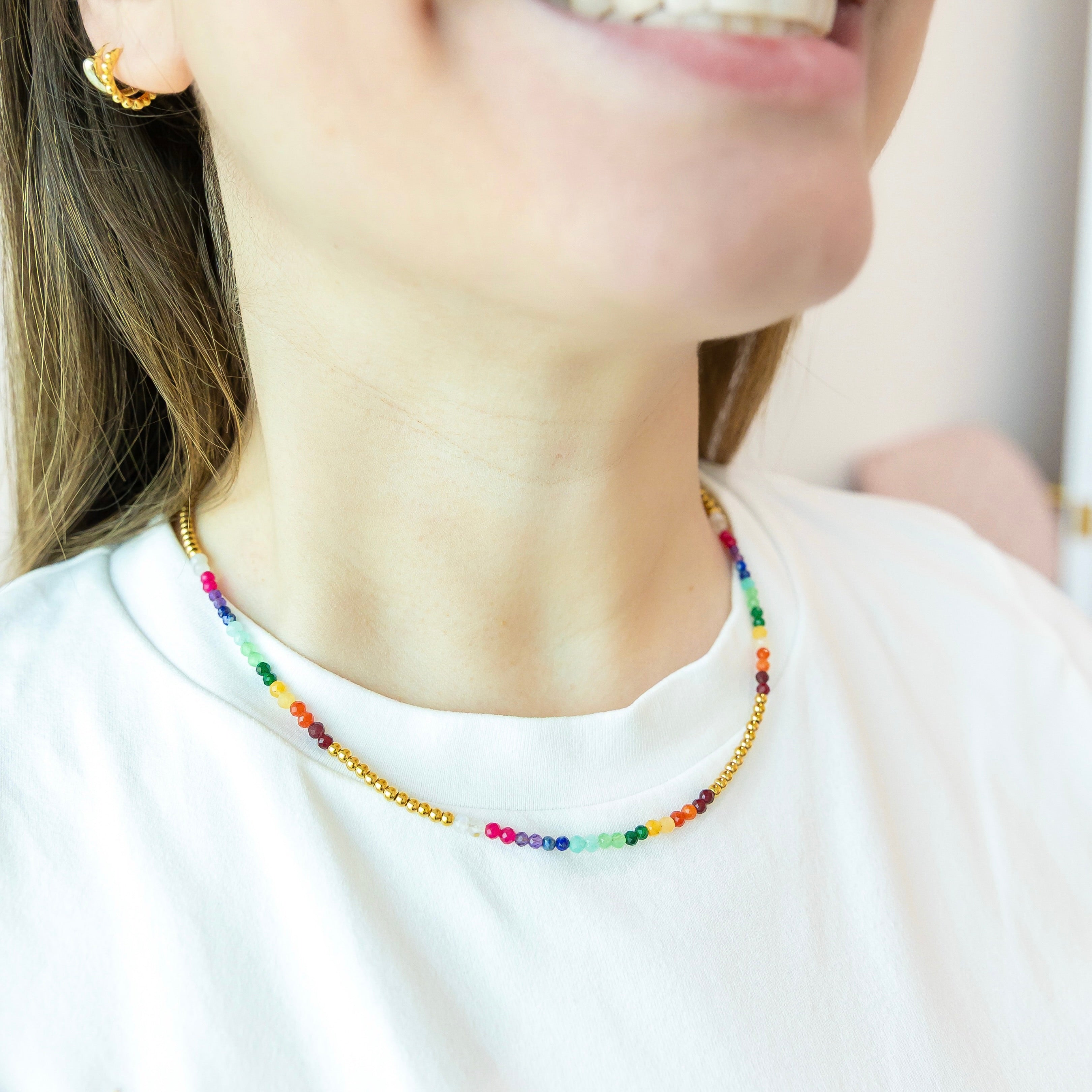Sprinkle some color into your jewelry collection with this Rainbow Gemstone Gold Beaded Necklace. Each vibrant gemstone bead catches the light in its own fabulous way, creating a kaleidoscope of hues that's impossible to ignore. Strung on delicate gold accents, this necklace is your ticket to looking effortlessly chic and wonderfully bold. Layer it, wear it solo, or mix it with your other favorites—this playful piece is ready for whatever adventure you've got planned.