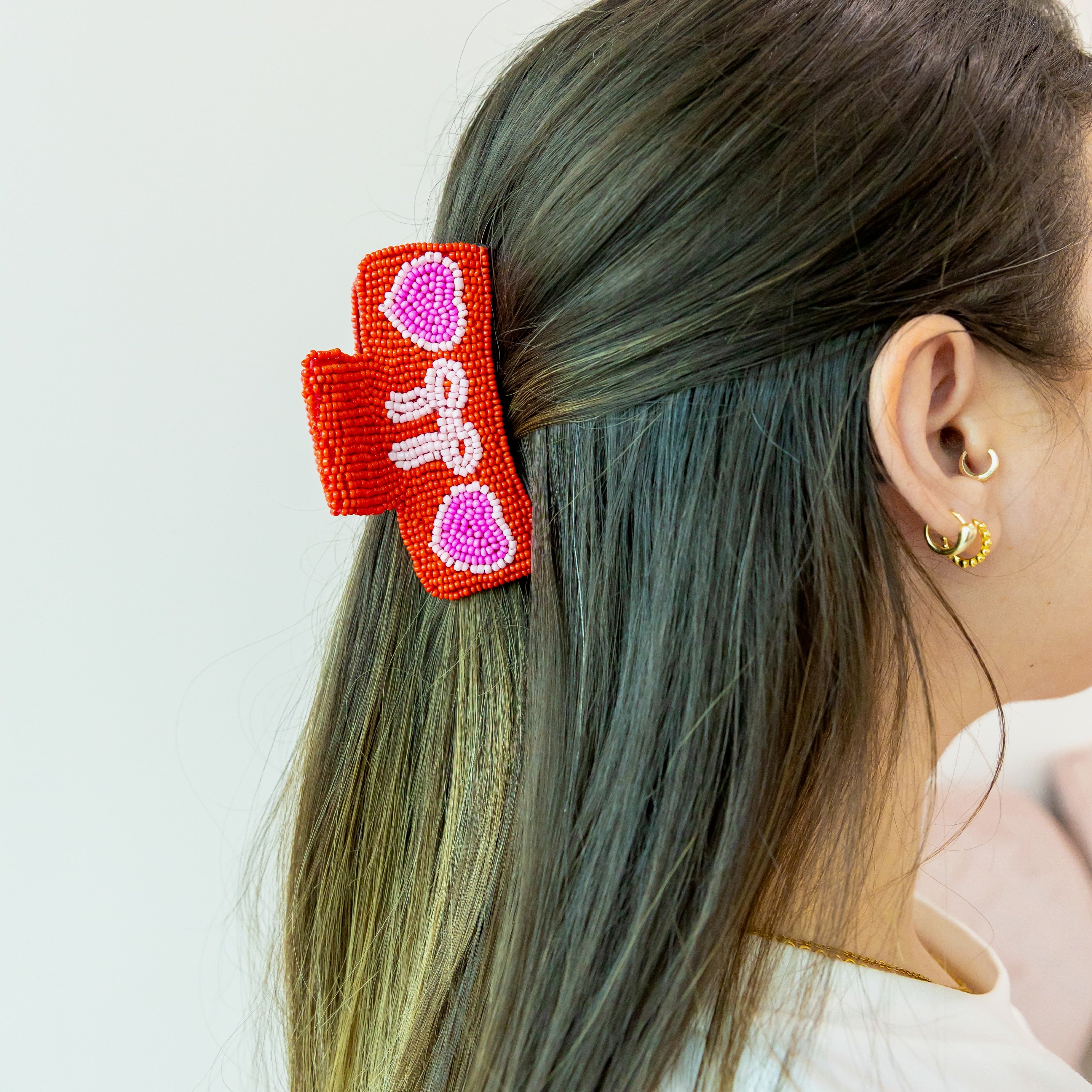 Grab hearts and bows with this adorable claw clip! Featuring a charming red and pink heart design topped with a delicate bow, it's the perfect accessory for adding a touch of romance to your look. The secure claw grip keeps your hair in place all day while the cute aesthetic makes every hairstyle feel special. Whether you're styling an updo, half-up look, or securing a ponytail, this playful clip brings instant charm and personality to your hair game.